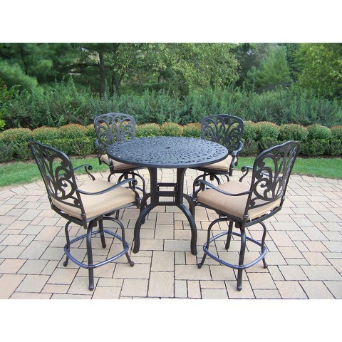 143480 5-Piece Dining Set Includes 4 Aluminum Sling 143498 9 ' Market Umbrella 143457 Umbrella Base 143462 3-Piece Bar Set Includes 2 Aluminum Sling Bar Stools Sleek powder coated steel frames in dark brown with this patio set offers comfort and easy outdoor living. Featuring rich ... Read Full Source